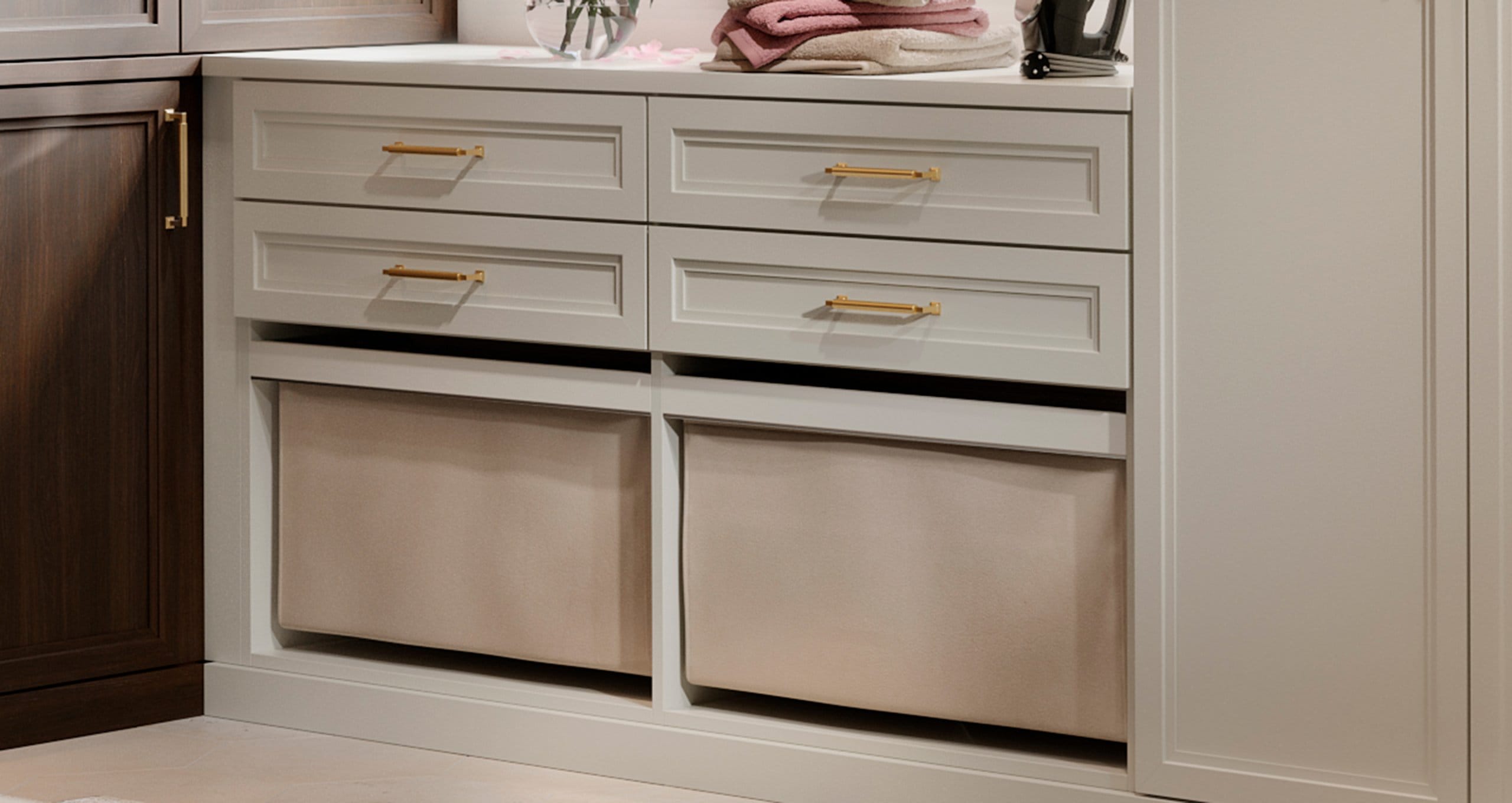 Having a designated place to store dirty laundry can prevent clothes from piling up on the floor. It also makes it easier to gather them up when it’s time to wash. Some of our laundry hamper basket options include: slide out hampers, pull out hampers, and removable hampers. You can also add a liner to keep your space looking tidy and protect your more delicate clothing items.